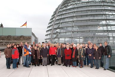 Ein dichtes Besuchsprogramm führte die Reisegruppe zuerst in das Zentrum der politischen Macht, in den Reichstag. Bei dem Besuch der Penarsitzung des Bundestages konnten die Teilnehmerinnen und Teilnehmer ihren Abgeordneten gleich in Aktion erleben: Im Rahmen der Fragestunde des Parlamentes an die Bundesregierung thematisierte Rainder Steenblock die Zukunft der deutsch-polnischen Beziehungen nach dem Regierungswechsel in Polen, vor dem Hintergrund der Rede der Bundeskanzlerin Angela Merkel beim Bund der Vertriebenen. Im Anschluss traf sich die Gruppe zum persönlichen Gespräch mit Rainder Steenblock. Hier war nicht nur der Arbeitsalltag des Abgeordneten Thema, es ging auch um Fragen der Privatisierung von Staatskonzernen (Post und Bahn) und die Zukunft der Energiepolitik. Ein Gang auf die Glaskuppel bot anschließend Ausblicke von oben auf das Parlaments- und Regierungsviertel.